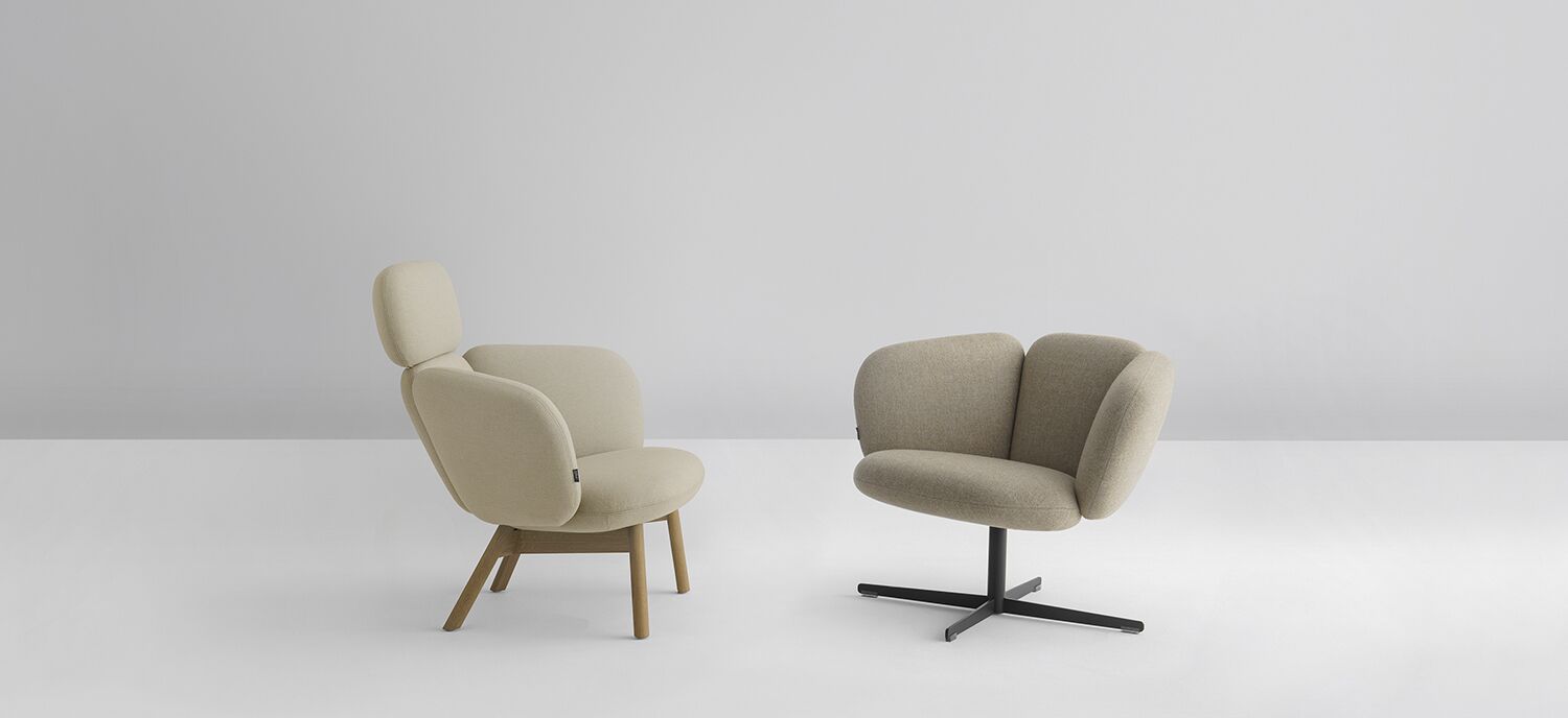 Choose from a traditional low-back easy chair or a high-back armchair with head support. Both are available with a hardwood four-leg base or a steel four-star swivel base finished in Studio TK’s 26 Fundamental and Fashion metal powder paints. To learn more, please visit https://www.studiotk.com/products/braso.