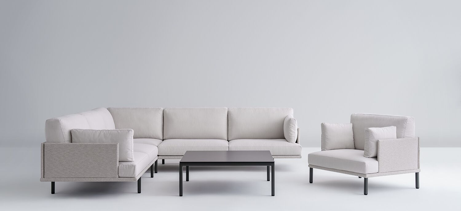 Simple and straightforward, POINT Origin is a collection of lounge seating and occasional tables designed for casual indoor use and specified for outdoor durability. Designed by Mario Ruiz, the collection includes lounge chairs, two-seat and three-seat sofas, and matching occasional tables. Featuring simple lines with discreet design gestures, Origin sofas can be used individually or grouped together with single-arm sofas to create larger configurations or L-shaped arrangements. Despite the minimalistic appearance, the furniture is exceptionally comfortable. Origin features sturdy welded aluminum frames paired with thick foam cushions, available in 30 outdoor graded-in fabrics from Luum and Sunbrella. When specified for outdoor durability, Origin is equipped with cushion water barriers, as well as UV-resistant and weatherproof textile patterns and colors. The tables come with solid or marbled HPL surfaces on a solid core, ensuring durability for indoor and outdoor settings. The aluminum frames of the chairs and sofas can be easily stacked, requiring minimal storage space when temperatures drop.