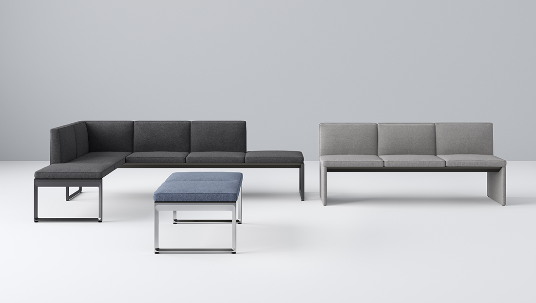 Clique’s preconfigured benches simplify specification. Upholstery options include different fabrics available from Luum Textiles, plus COM/COL. Clique is offered with an upholstered leg base, or a metal hoop leg in aluminum and painted finishes.