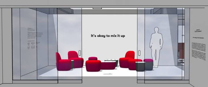 A small opening connects to a second, more dynamic room, with artwork and installations suggestive of the power of social engagement and interaction. This center space is devoted to a Studio TK brand exposition. Throughout this inner brand experience, visitors find more residential finishes and colors. The transition from the blank gallery into a warm, vibrant experience is complete. Here, one also experiences a collaborative environment with Cesto poufs that create more casual spaces that could be used in break-out rooms or areas of ideation. An alcove to the right highlights the new agreement with Artifort and includes a collection of four products celebrating the new partnership – Beso seating collection, Pala lounge, Kalm lounge and Nina seating.
