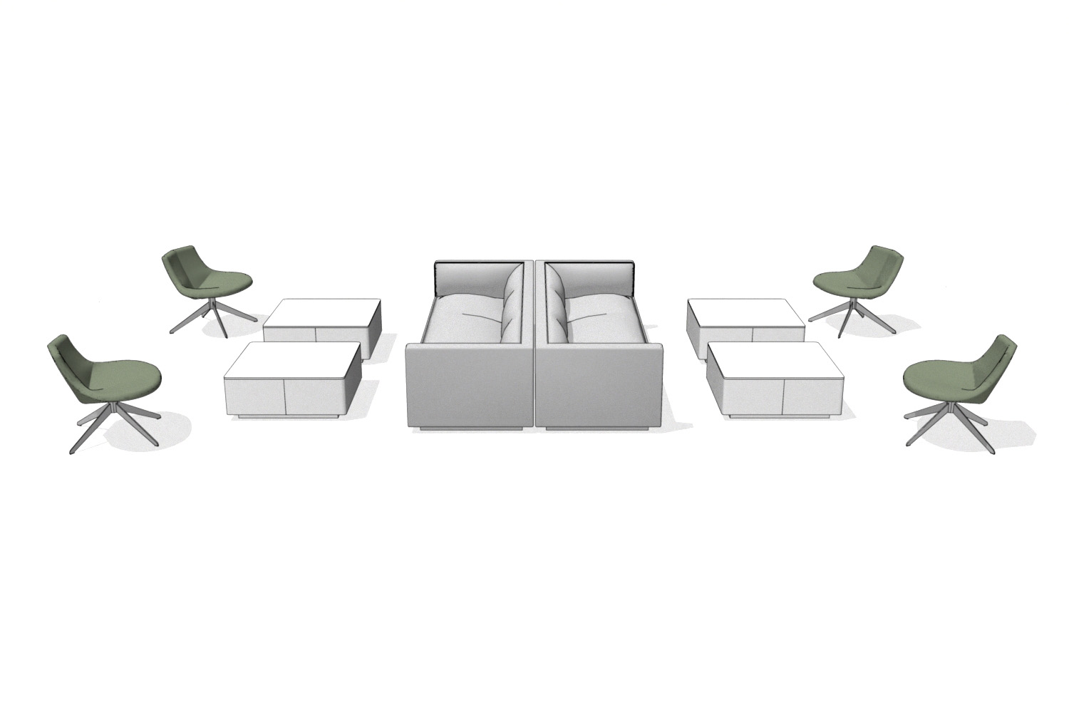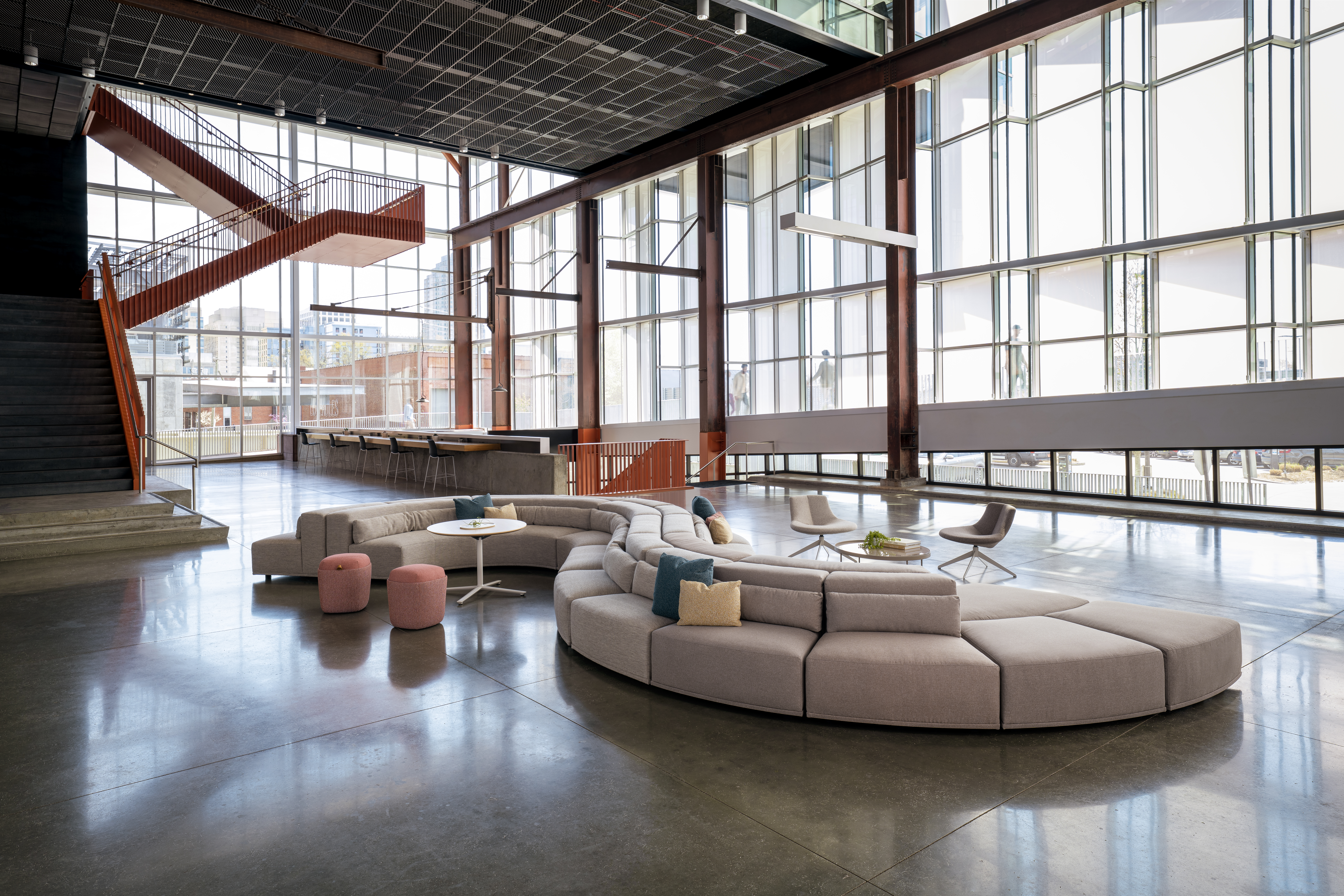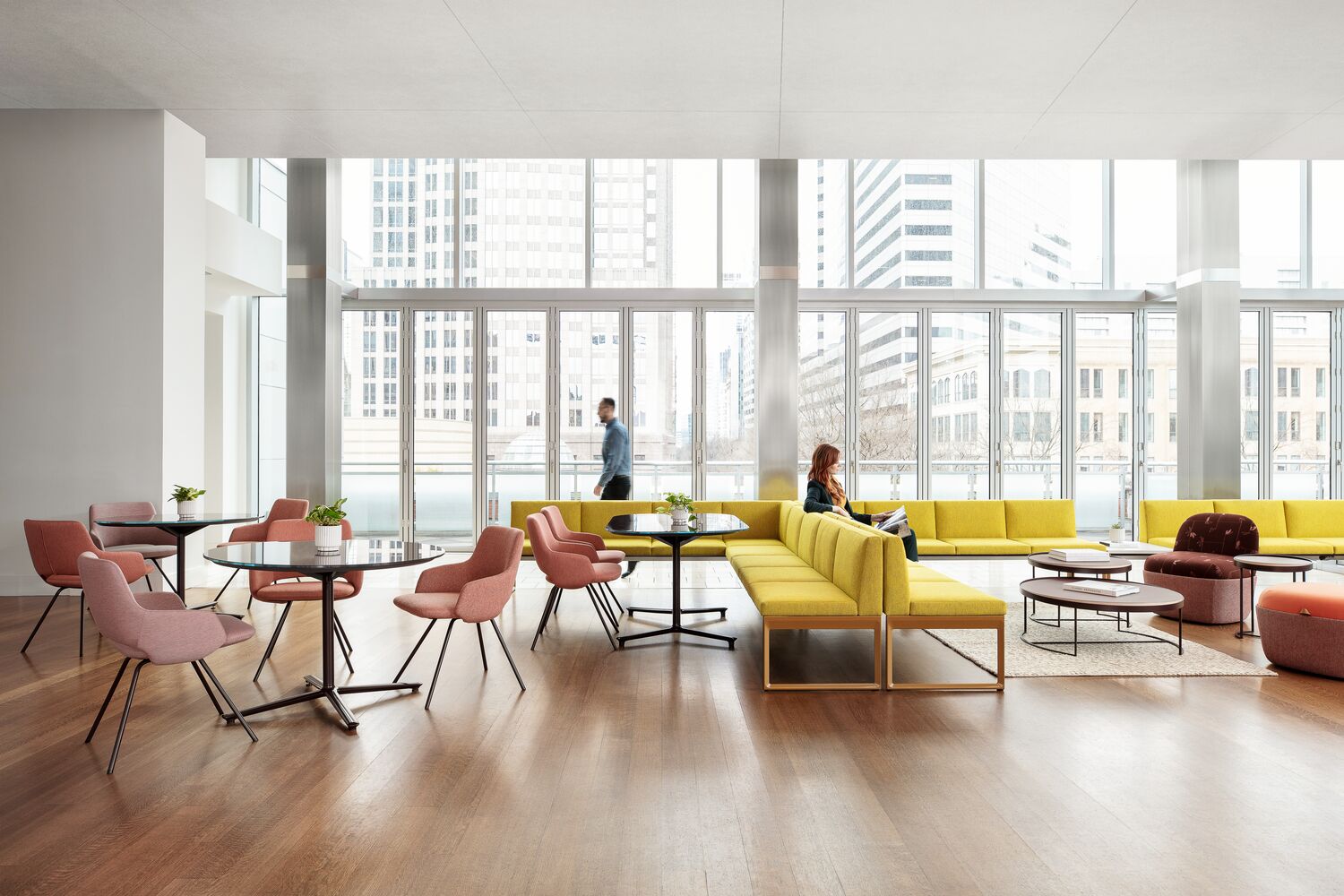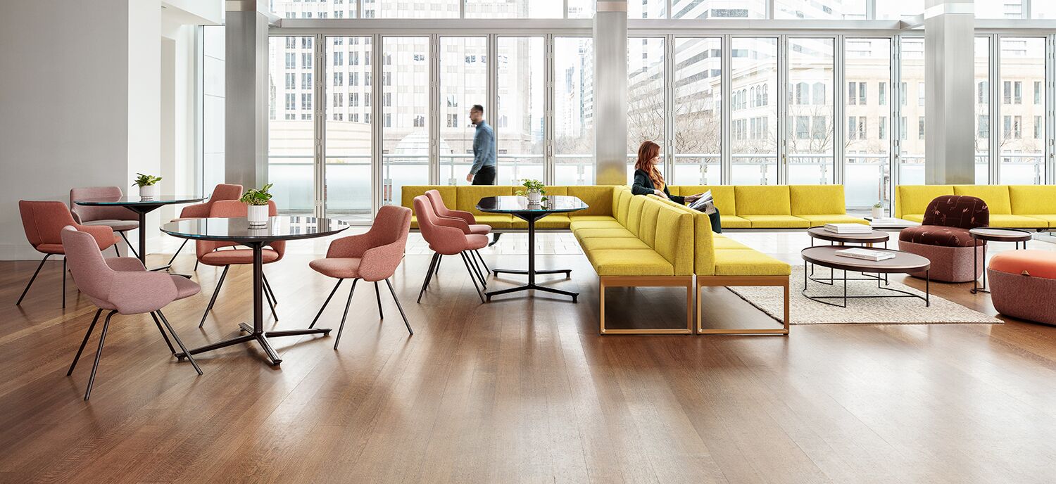 Public settings live within high-traffic circulation spaces. Amid the continuous movement of people around buildings and across corporate campuses, public settings help companies express their brand identity, organizational values and culture. They give employees a place to pause as well as create opportunities for serendipitous connection.
